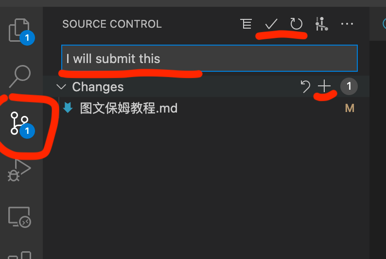5 commit change your code, save, and then give a message, and click the check sign to commit